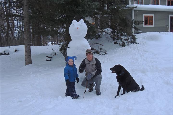 Samuel and David had a good trip / good time on their visit to Maman's friend in Thetford Mines.  When Grandpa, Barbara and Uncle Grant returned a very tired Boots (long walk today) to his family late Sunday afternoon, we had fun together.  First. a snowball fight led by Papa who ambushed us.